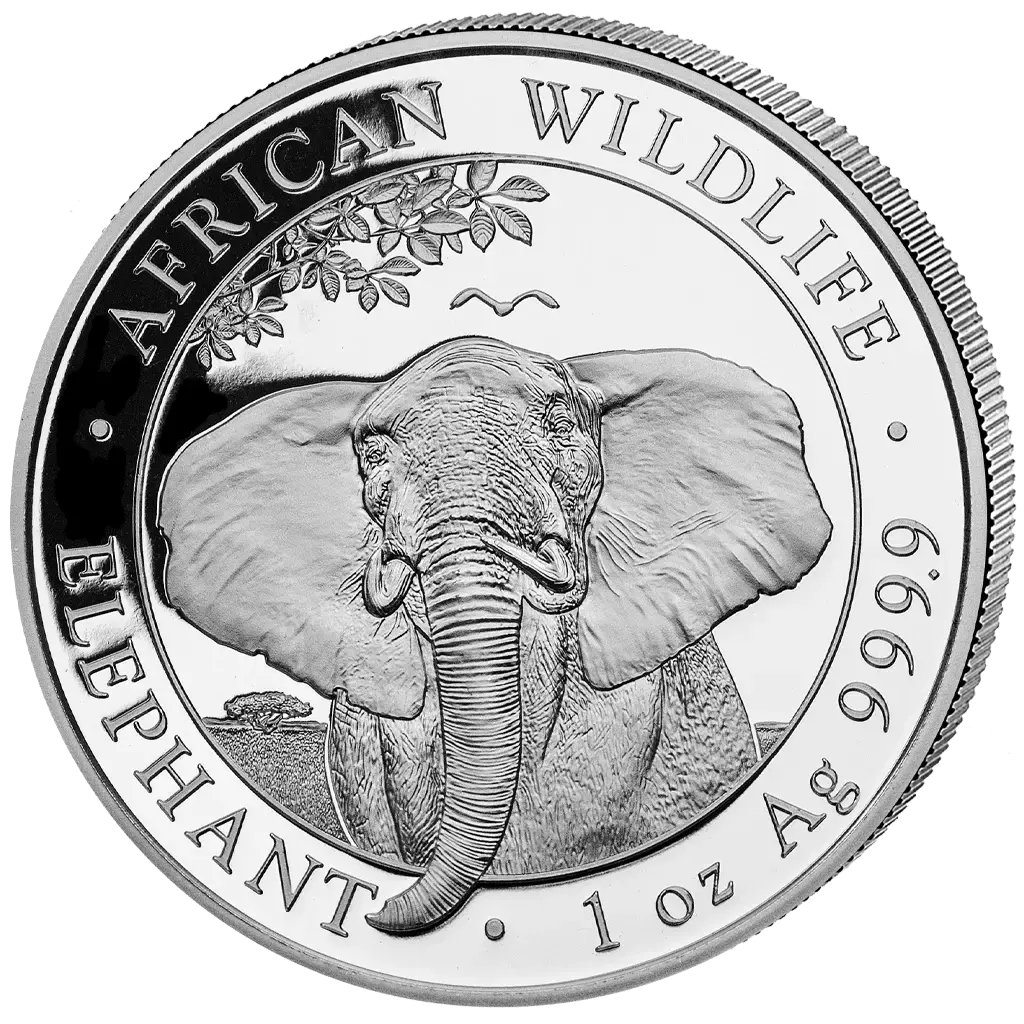 Frappée en 2021 dans le cadre de la série African Wildlife, cette monnaie d'investissement en argent est fabriquée à partir de 1 once d'argent pur 0,9999 et représente l'éléphant de Somalie. Cette série est connue pour ses motifs qui changent tous les ans et qui suscitent un vif intérêt chez les collectionneurs et les investisseurs. Le revers présente un portrait saisissant d'un éléphant adulte sur fond de savane africaine. Sa trompe dépasse le cadre du dessin, créant une impression dynamique de profondeur et de mouvement. La composition souligne à la fois la puissance de l'animal et l'innovation artistique de la série.