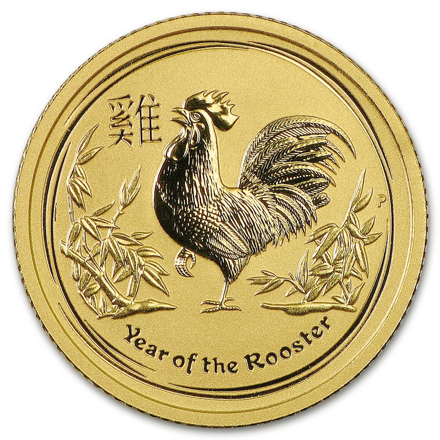 Dans le zodiaque chinois, le coq représente la vigilance, la précision, la diligence et la confiance - un signe associé à la clarté des objectifs et à la force de caractère. Le revers représente un coq debout dans une scène chinoise stylisée avec des bambous et des feuilles dans le champ de la pièce, à côté du caractère chinois pour " Coq ", de l'inscription " Année du Coq " et de la marque d'atelier traditionnelle " P " de The Perth Mint. L'avers présente l'effigie de la reine Élisabeth II, réalisée par Ian Rank-Broadley, ainsi que la dénomination et la pureté de l'or. Frappée par The Perth Mint à partir d'une once (15,55 g) d'or fin 0,9999, la pièce a une valeur faciale de 50 dollars australiens, mesure 30,6 mm de diamètre et est livrée dans une capsule protectrice.