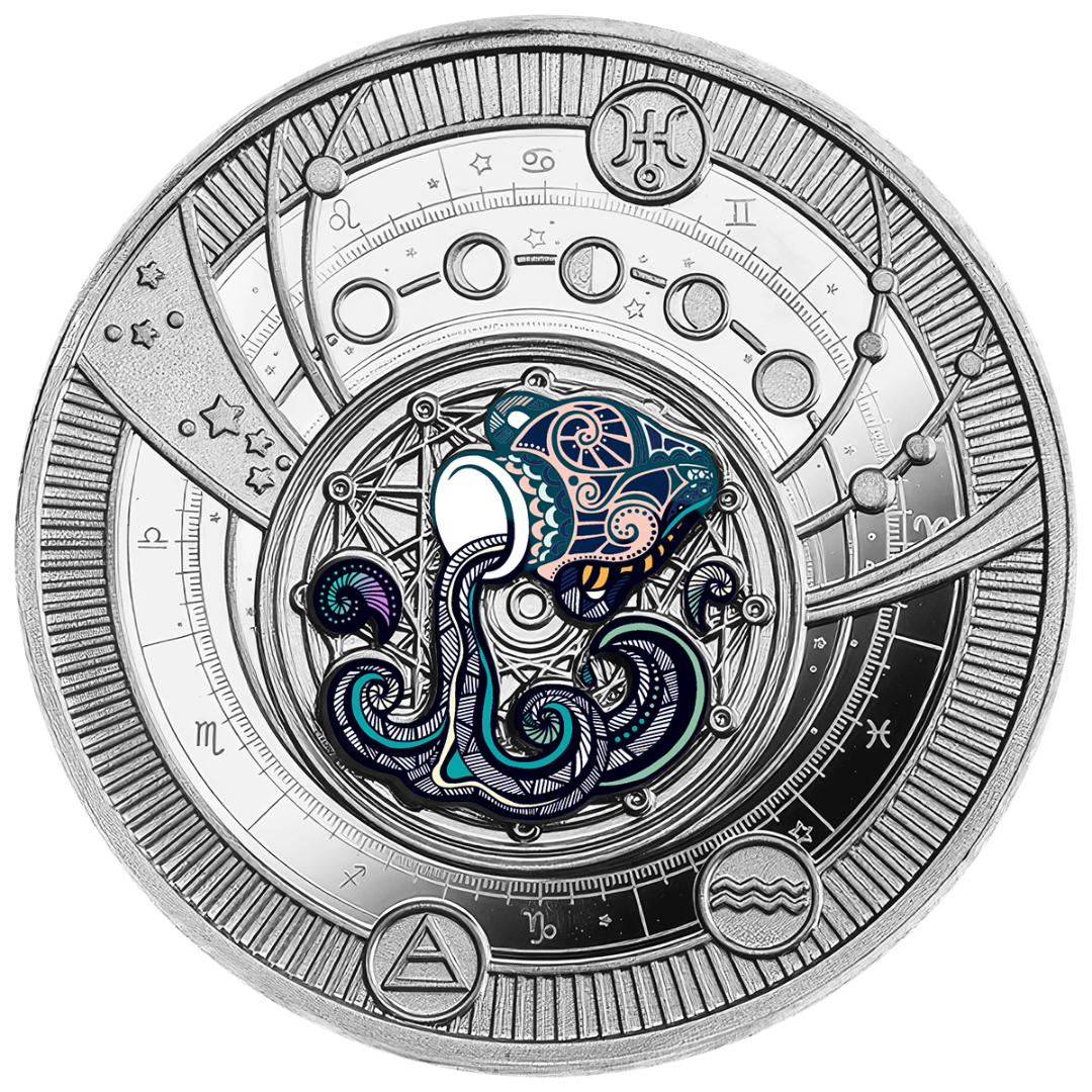 Cameroun : pièce de collection en argent Signes du Zodiaque. Verseau 2025 (pendentif), Belle Épreuve, colorée, 10 g d'argent pur (0,999)