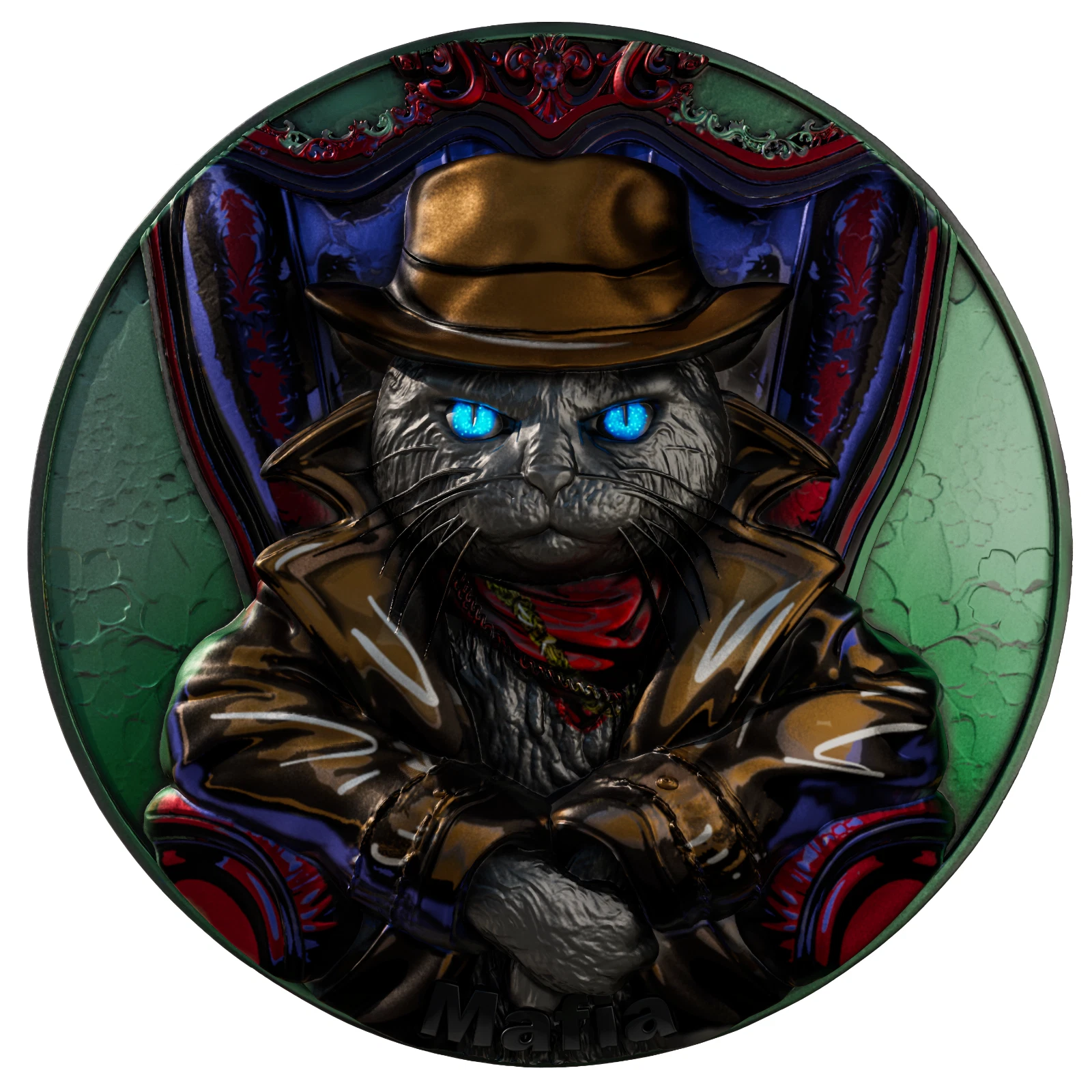 Cette impressionnante pièce de 2 once en argent donne le coup d'envoi de la série "Meow", dédiée aux membres charismatiques et dangereux du monde félin. Le revers représente un majestueux chef de la mafia féline, qui rayonne de confiance et de froide supériorité. Avec ses yeux bridés, son chapeau incliné et sa position de commandement, il respire le pouvoir et l'instinct sauvage. La pièce présente une finition antique et un haut relief qui mettent en valeur chaque détail du dessin. Un élément spécial brille dans l'obscurité, ajoutant une touche supplémentaire de mystère. La pièce est présentée dans un élégant coffret avec un certificat d'authenticité et est limitée à 199 exemplaires pour le monde entier.