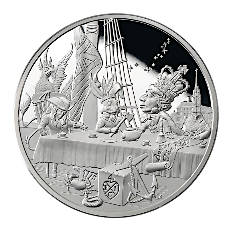 Pièce en argent Niue " 250 ans du Boston Tea Party : Alice's Tea Party" (épreuve), 2023, 155,5 g. argent pur (épreuve 0,999).