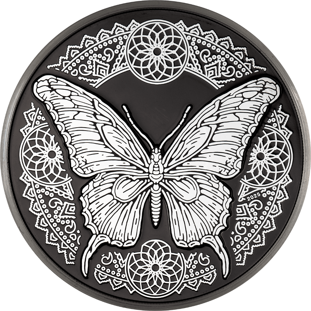 Cette exquise pièce d'argent de 1 once est dédiée au papillon, un délicat symbole de transformation, de renouveau et d'harmonie intérieure. Son design s'articule autour d'un contraste saisissant entre le papillon lumineux et le fond noir obsidien profond, qui donne à chaque détail un aspect presque extra-terrestre. Le concept artistique met en évidence l'idée de transformation et la beauté fragile incarnée par cette gracieuse créature. La pièce est frappée en qualité Belle Épreuve noir obsidienne et est livrée dans un coffret avec un certificat d'authenticité. Le tirage est limité à 999 pièces pour le monde entier.