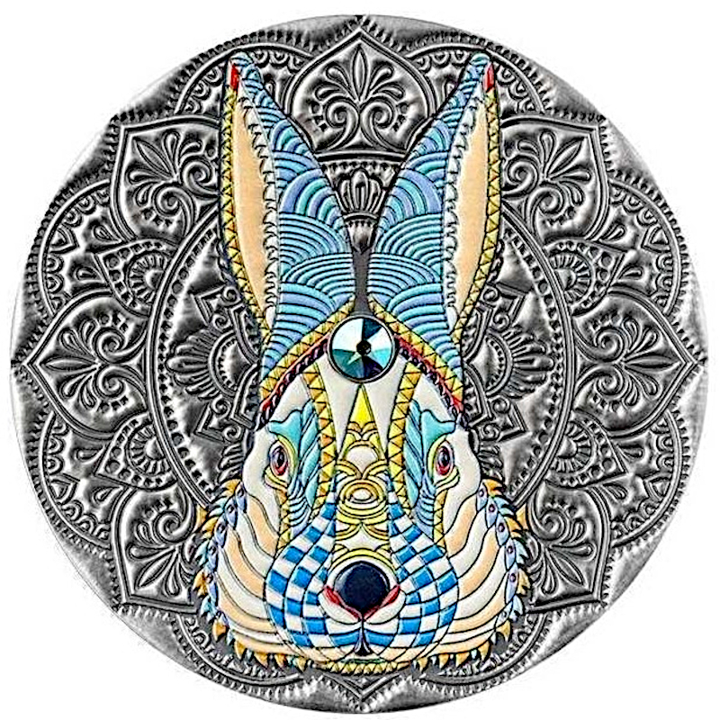 Cette exquise pièce d'argent de 2 once fait partie de la série Mandala Art et est dédiée à l'année du lapin. Le revers présente une représentation stylisée et vivante d'un lapin, créée par impression numérique et embellie de motifs de mandala et de cristaux Swarovski. La pièce se distingue par sa composition artistique soigneusement étudiée et sa finition antique, qui rehausse la profondeur du relief. La pièce est présentée dans un élégant coffret et accompagnée d'un certificat d'authenticité. Le tirage est strictement limité à 500 pièces dans le monde entier.