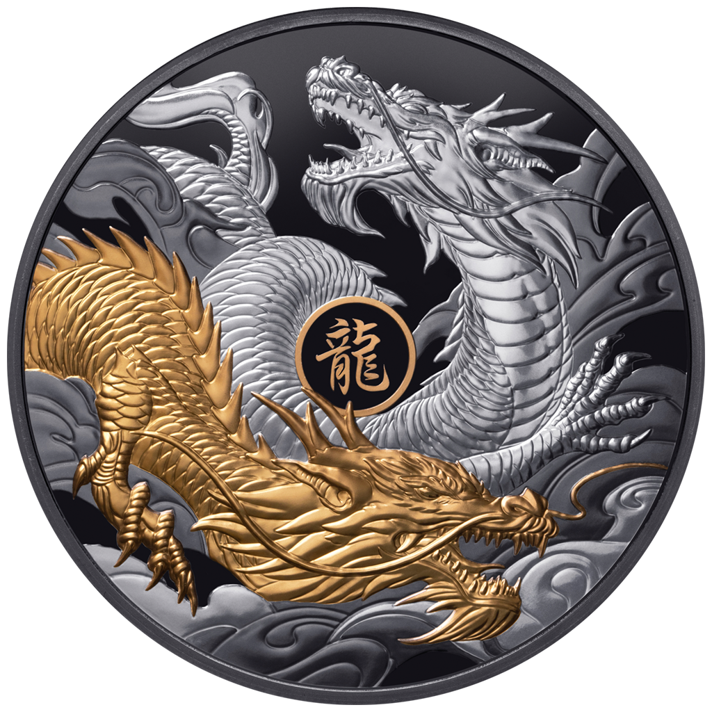 Cette impressionnante pièce d'argent de 5 once est dédiée au dragon, le cinquième animal du calendrier lunaire. Le revers représente deux dragons entrelacés, dont l'un est rehaussé d'une dorure sélective, le caractère chinois pour " dragon " étant placé au centre. La pièce se distingue par son dessin raffiné, son relief expressif, ses accents d'or exclusifs et sa qualité distinctive de Belle Épreuve noire. La pièce est présentée dans un coffret en bois et accompagnée d'un certificat d'authenticité. Le tirage est strictement limité à 888 pièces pour le monde entier.