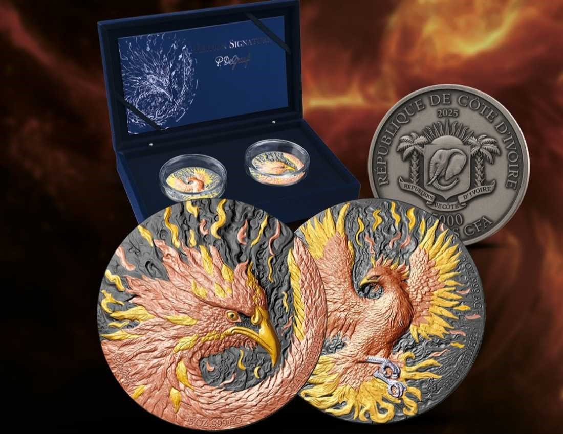République de Côte d'Ivoire : pièces de collection en argent Phoenix 2025, ensemble de 2*155,5 g d'argent pur (0,999)