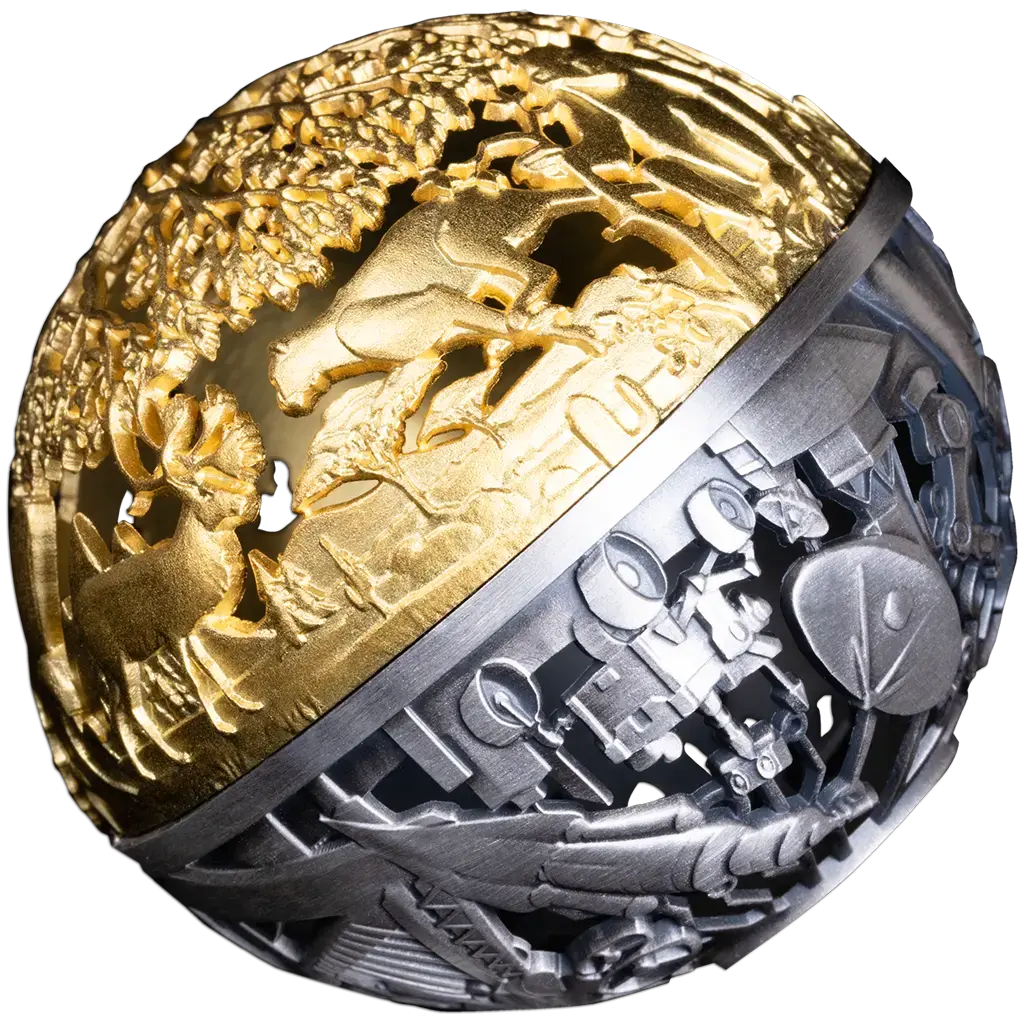 Cette remarquable pièce d'argent sphérique de 2 Once incarne l'harmonie entre les forces primitives de la nature et les progrès technologiques rapides de l'humanité. Sa forme inhabituelle renforce le concept d'équilibre, conférant au dessin un caractère nettement futuriste et mémorable. La finition antique, combinée à un filigrane ultrafin et à un placage en or 24 carats, souligne la profondeur du concept artistique et le savoir-faire artisanal qui sous-tend la pièce. La pièce est livrée dans un coffret avec un certificat d'authenticité. Le tirage est limité à 1 499 pièces pour le monde entier.