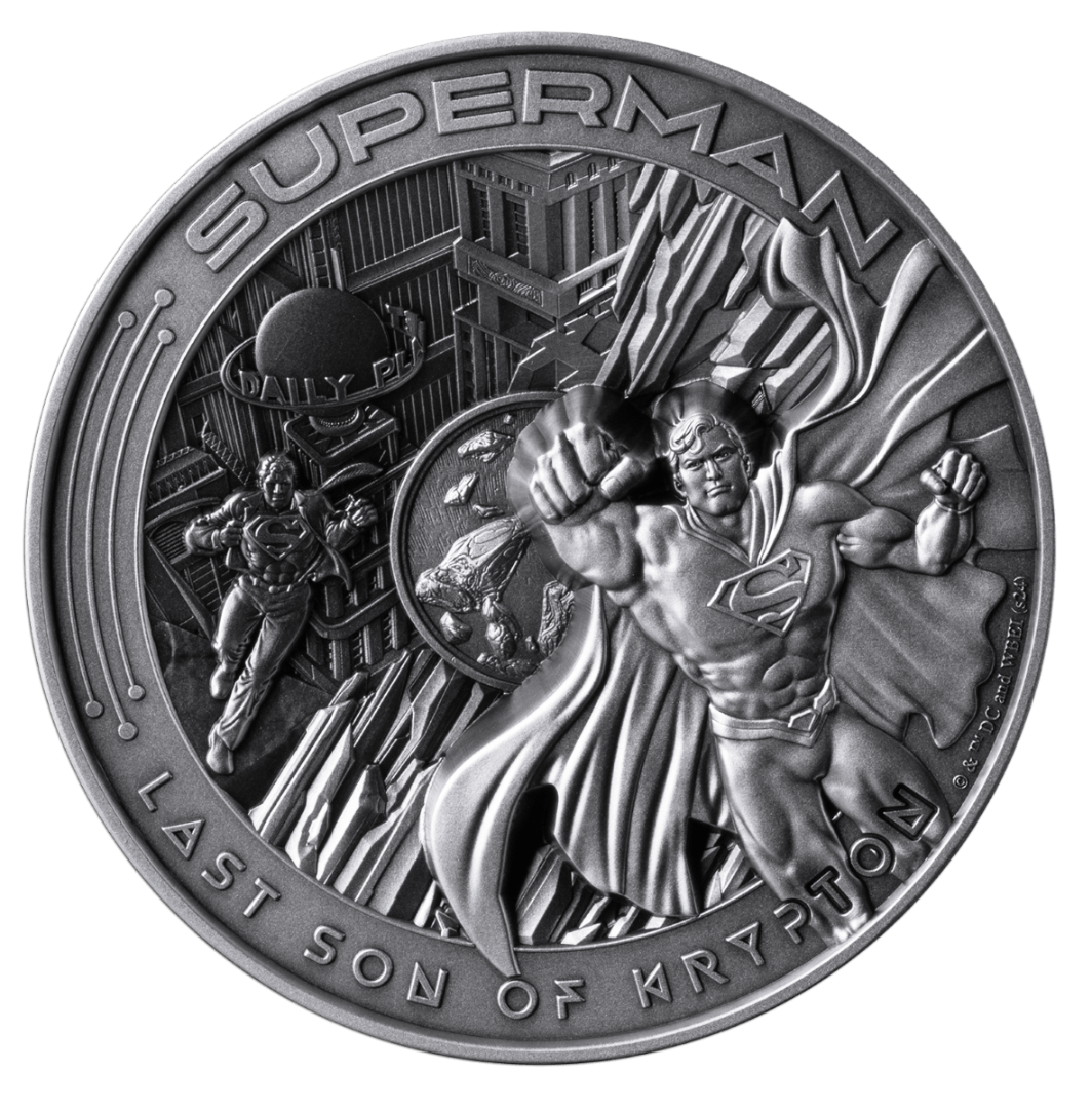 Cette pièce impressionnante rend hommage à Superman, le premier et le plus emblématique des super-héros de l'univers DC. La pièce présente une finition antique et des techniques de frappe multicouches avancées qui renforcent la profondeur et l'impact visuel du dessin. Le revers représente Superman s'élevant à travers la ligne d'horizon de Metropolis avec le légendaire bâtiment Daily Planet en arrière-plan, ainsi que des éléments thématiques faisant référence à la kryptonite. L'avers présente les armoiries des Samoa ainsi que les inscriptions " SAMOA ", " 10 Once Ag .999 ", " 2025 " et la dénomination " 10 DOLLARS "."Chaque pièce porte un numéro de série unique et est présentée dans un coffret à thème avec un certificat d'authenticité, ce qui en fait un objet de collection exceptionnel pour les numismates et les fans de DC.